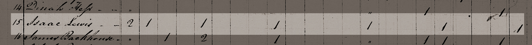 [13] 1830 U.S. Census, Hamilton County, Ohio, population schedule, Whitewater township, p. 273 (penned), line 15, Isaac Lewis; imaged as “United States Census, 1830,” FamilySearch (https://www.familysearch.org/ark:/61903/3:1:33SQ-GYBM-9N2J?cc=1803958 : accessed 24 July 2018),  Ohio > Hamilton > Whitewater > image 1 of 20; citing NARA microfilm publication M19, roll 132.